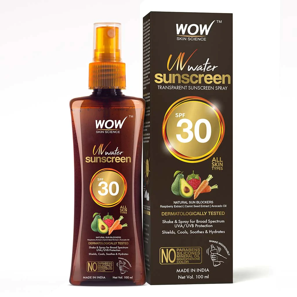 Keep your skin hydrated and protected from sun’s harsh rays with WOW Skin Science Sunscreen UV Water Spray SPF30++. It gives your skin effective broad spectrum protection against sun’s harmful UVA & UVB rays. The UV water is infused with the goodness of raspberry, carrot seed extract, avocado oil and almond oil. The simple shake and spray action makes applying sunscreen very easy. Just shake the bottle and spray all over moisturized skin. Its non-oily, non-sticky and non-patchy formulation spreads instantly and evenly to create a transparent film that shields your skin from sun damage and pollutants. It can be used over your makeup to give your skin added protection. It also keeps skin hydrated and nourished. No streaks, no mess, no fuss. Just spray as and when required.